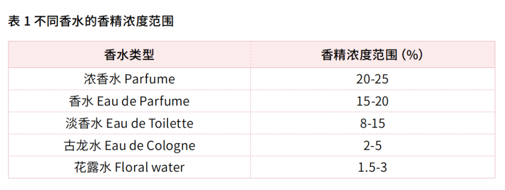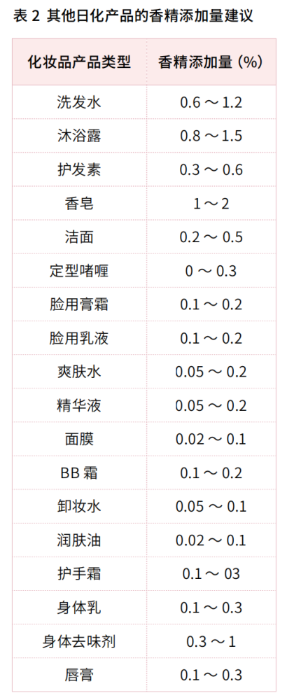 其次是關(guān)于香精的添加量。香精的添加量與產(chǎn)品本身的基質(zhì)有關(guān)系,也與產(chǎn)品開發(fā)者想表達(dá)的內(nèi)容有一定關(guān)系。針對不同的產(chǎn)品,香精香料添加量有一個參考的范圍,可以參考表1不同香水的香精濃度范圍、表2其他日化產(chǎn)品的香精添加量建議。