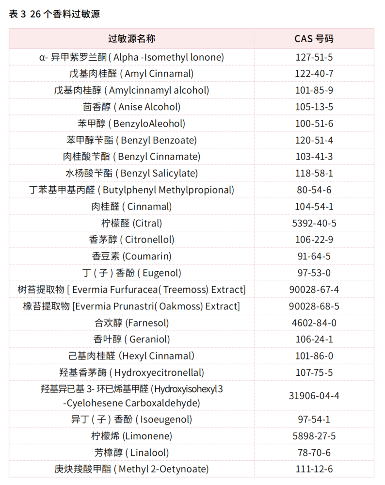 大部分的香原料在IFRA規(guī)定的使用量范圍內(nèi)是安全的,部分香原料存在過敏問題。2003年,歐盟化妝品安全委員會COLIPA(現(xiàn)更名為SCCS)將26種具有致敏性的香精原料列入附錄III (化妝品組分限用物質(zhì)清單),就是俗稱的26種過敏源香料成分。并規(guī)定當(dāng)在停留型化妝品(leave-on)該成分添加超過10PPM(0.001%),或者在洗去型化妝品(rinse-off)該成分添加超過100PPM(0.01%)時,必須在產(chǎn)品的標(biāo)簽中標(biāo)注該成分的名稱。關(guān)于26個過敏源的內(nèi)容可見表3。