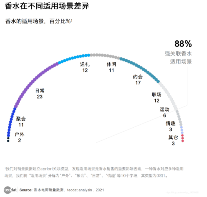 通過apriori關聯(lián)模型發(fā)現(xiàn),大多數(shù)香水適用場景之間的關聯(lián)性非常強,表明大多數(shù)香水產(chǎn)品不僅有一個適用場景,而是有多個適用場景。大多數(shù)適用場合之間的關聯(lián)性非常強,日常、約會、職場、聚會派對出現(xiàn)的次數(shù)最多,而且是相互關聯(lián)性最強的場所,情趣、運動、其他與其他場所關聯(lián)性不大,說明這三類場所針對性較強。