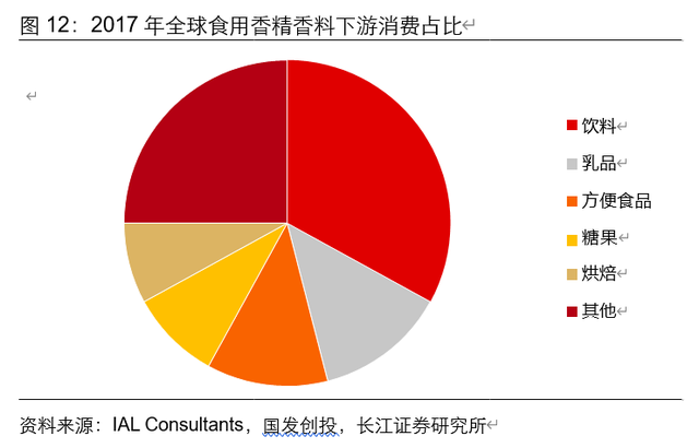 應(yīng)用以食用和日化為主,作為嗅覺的“美化劑”。全球香精香料市場(chǎng)中,食用香精香料占比約為 56%,日用香精香料占比約為 44%(煙用香料市場(chǎng)規(guī)模相對(duì)較小,國(guó)外煙用香精香料劃分在食用香精香料領(lǐng)域)。食用香精香料能夠給食物原料賦予香味,矯正食品中的不良?xì)馕?,同時(shí)可以補(bǔ)充食品的香氣不足,穩(wěn)定和輔助食品中的固有香氣。食用香料主要應(yīng)用于飲料、乳制品、方便食品、糖果和烘焙食品中,終端需求市場(chǎng)較為分散。日化香精香料主要用于矯正日化產(chǎn)品中不適的氣味,產(chǎn)生令人愉快的氣味,提升產(chǎn)品檔次,主要應(yīng)用于香水、化妝品浴室用品清潔劑及洗滌劑等產(chǎn)品中。食品用香精又可以分為多個(gè)種類,其中規(guī)模占比最大的為飲料。整體看,全球香精香料下游消費(fèi)較為分散, 單一市場(chǎng)需求變動(dòng)對(duì)整體需求影響較為有限。下文將繼續(xù)從細(xì)分市場(chǎng)分析香精香料產(chǎn)品需求及增速。