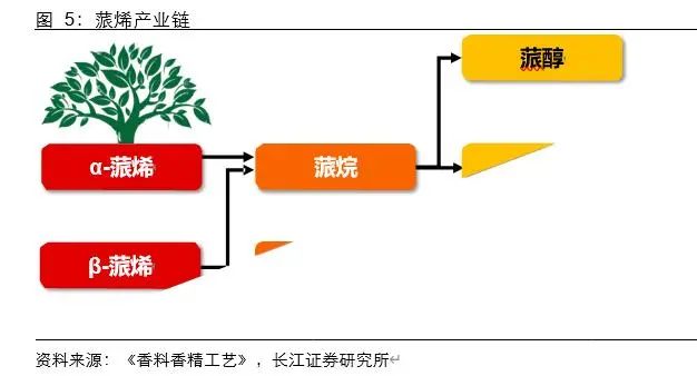 蒎烯:產(chǎn)業(yè)鏈下游需求集中于香葉醇和檸檬醛。蒎烯存在于天然松節(jié)油中,世界松節(jié)油年產(chǎn)量在 30 萬(wàn)噸左右,蒎烯主要有 α 型和 β 型兩種異構(gòu)體。全球蒎烯年生產(chǎn)量超過 9 萬(wàn)噸,主要用于合成芳樟醇、香葉醇、檸檬醛等多種大宗香精香料。由于天然松節(jié)油主要從松樹松脂提取,自然產(chǎn)量受限,天然半合成市場(chǎng)供給仍趨緊。