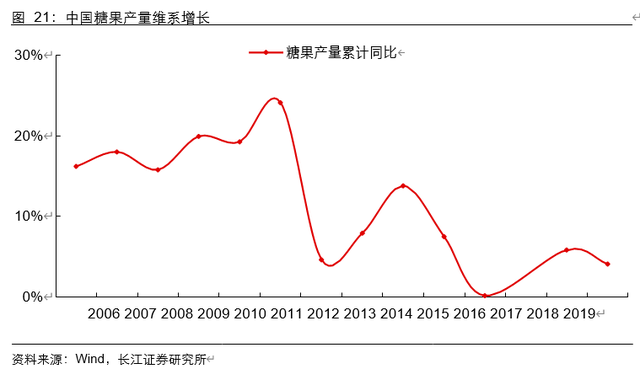 食用市場(chǎng):中國(guó)軟飲料及成品糖產(chǎn)量整體穩(wěn)中向上。據(jù)中國(guó)香化協(xié)會(huì)數(shù)據(jù),隨著我 國(guó)食品工業(yè)快速發(fā)展,我國(guó)食用香精香料需求快速增加,占整個(gè)香精香料市場(chǎng)比例 已經(jīng)超過 50%。今年疫情擾動(dòng)了短期消費(fèi),而中長(zhǎng)期不改行業(yè)趨勢(shì)。未來(lái),國(guó)內(nèi)食品工業(yè)有望保持增長(zhǎng),帶動(dòng)我國(guó)農(nóng)副食品加工、食品制造和飲料制造子行業(yè)增長(zhǎng), 食用香精香料需求仍有望維持較高增速。下游產(chǎn)品產(chǎn)量中,近幾年中國(guó)軟飲料和乳 品市場(chǎng)維持 5%左右增長(zhǎng),相關(guān)食用香料需求穩(wěn)定增加。中國(guó)糖果產(chǎn)量整體維持穩(wěn)定,糖果用香料仍能維系穩(wěn)定增長(zhǎng)。隨著居民消費(fèi)水平提升,軟飲料和乳品產(chǎn)量仍 有望維持增長(zhǎng),軟飲料和乳品相關(guān)香精香料需求有望提升。