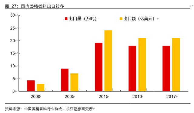 國(guó)內(nèi)出口香精香料較多。我國(guó)已在部分大宗香精香料領(lǐng)域形成核心競(jìng)爭(zhēng)優(yōu)勢(shì),出口產(chǎn)品集中在香蘭素、香豆素、麥芽酚等多種大宗香精香料產(chǎn)品。2015 年到 2017 年國(guó)內(nèi)香精香料產(chǎn)品出口量維持在 18 萬(wàn)噸左右,出口量占總產(chǎn)量比例在 30%左右。