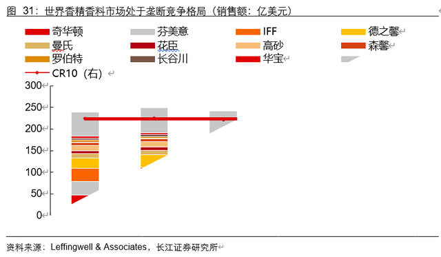 持續(xù)性高研發(fā)投入,鞏固龍頭地位。新型香精香料產(chǎn)品能給產(chǎn)品帶來(lái)一定差異化, 提升客戶粘性,搶占市場(chǎng)份額。世界香精香料巨頭均十分重視研發(fā),一般研發(fā)投入占總收入在 6%到 9%。這些資金主要用于各種新產(chǎn)品、新技術(shù)的開發(fā)等方面,有力地促進(jìn)了相關(guān)技術(shù)的發(fā)展和應(yīng)用。極高的研發(fā)投入鑄造了行業(yè)極高的競(jìng)爭(zhēng)壁壘, 促進(jìn)了行業(yè)壟斷競(jìng)爭(zhēng)的格局。