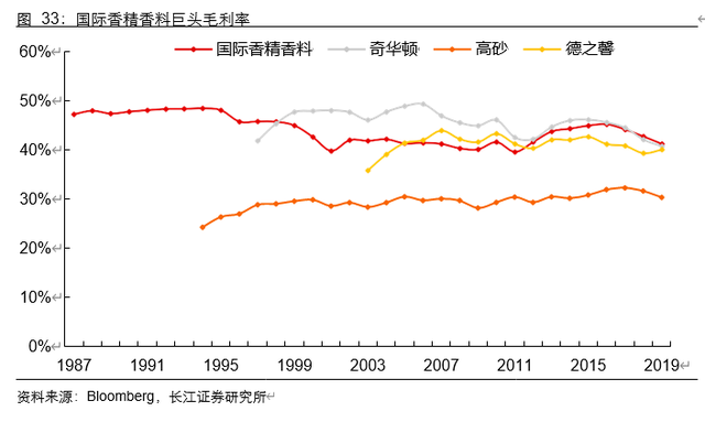 成本占比較低,毛利率水平較高。需求端,香精香料在下游企業(yè)生產(chǎn)成本占比較低,消費(fèi)屬性較強(qiáng),香精香料成分的微小差異可能引發(fā)行業(yè)需求巨大的變動(dòng),因此下游廠商對(duì)產(chǎn)品質(zhì)量要求較高,議價(jià)能力較弱。供給側(cè)壟斷競(jìng)爭(zhēng)的格局保障了專利配方的獨(dú)家供應(yīng), 市場(chǎng)供給端的議價(jià)能力較強(qiáng)。因此在強(qiáng)供給,弱下游的格局下,香精香料行業(yè)龍頭能夠維持較高毛利水平。