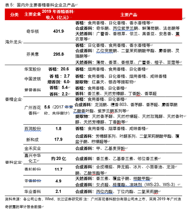 國(guó)內(nèi)營(yíng)收規(guī)模較小,綜合性香精香料企業(yè)較少。海外龍頭企業(yè)如奇華頓和芬美意,營(yíng)收規(guī)模龐大,產(chǎn)品結(jié)構(gòu)豐富,產(chǎn)業(yè)鏈布局完善,在天然香料、合成香料和香精配方均有布局,形成完整的產(chǎn)業(yè)鏈布局。香精企業(yè)中,華寶國(guó)際、中國(guó)波頓、愛普香料等在食用香精、日化香精和煙用香精領(lǐng)域各有所長(zhǎng)。香料企業(yè)中,新和成、金禾實(shí)業(yè)和嘉興中華化工以合成香料為主,青松股份以天然香料為主,亞香股份在天然香料和合成香料均有所布局。與國(guó)外企業(yè)相比,我國(guó)香精香料企業(yè)規(guī)模較小,產(chǎn)業(yè)鏈一體化程度仍有較大提升空間。
