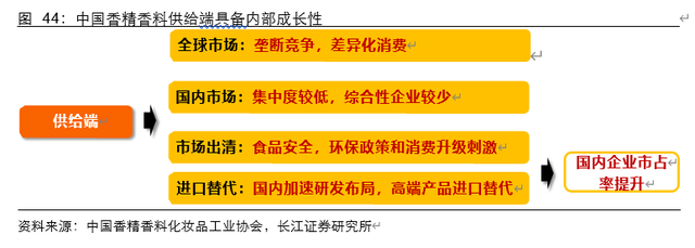 展望未來(lái),國(guó)內(nèi)食品安全、環(huán)保標(biāo)準(zhǔn)和消費(fèi)升級(jí)將顯著提升行業(yè)供給的競(jìng)爭(zhēng)壁壘,小型企業(yè)將更難通過客戶質(zhì)量驗(yàn)證、國(guó)家的環(huán)保審批和客戶的品牌選擇,面臨退出市場(chǎng)的風(fēng)險(xiǎn),供給端有望出清。國(guó)內(nèi)香精香料龍頭企業(yè)具備資金和技術(shù)優(yōu)勢(shì),市場(chǎng)占有率有望逐步提升。
