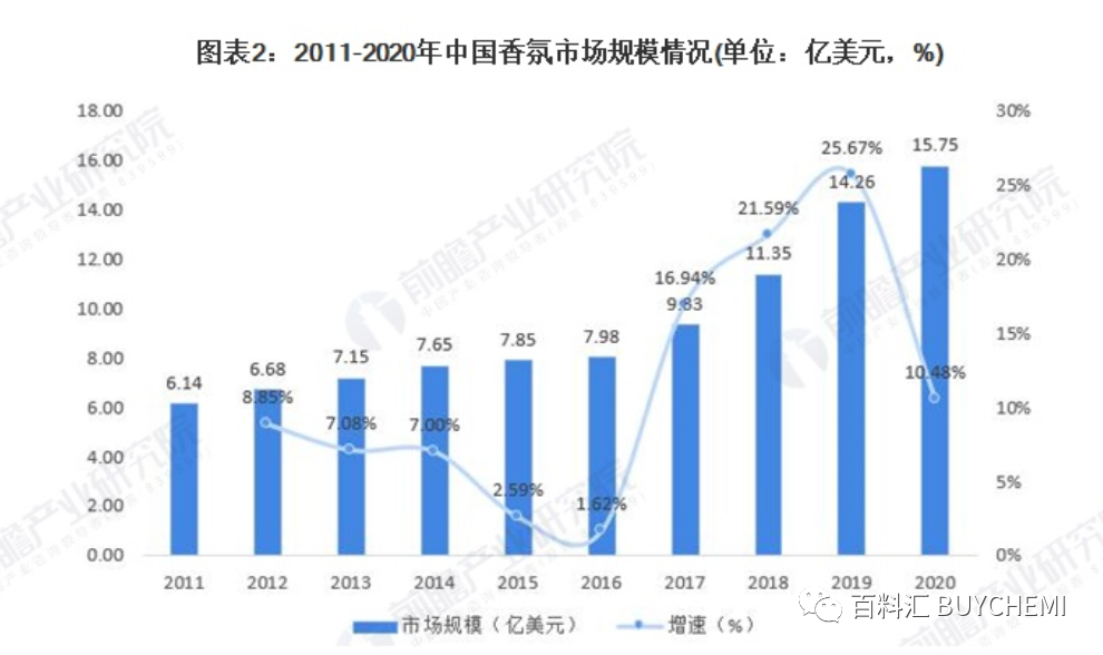 2011-2016年,由于使用香氛在國內(nèi)還未形成普遍的消費習慣,故市場規(guī)模相比其他日化子類較低。但是,2016年后,隨著中產(chǎn)階級人口逐漸增多,香氛產(chǎn)品作為能夠襯托出生活品質(zhì)的產(chǎn)品,香氛市場銷售量呈現(xiàn)爆發(fā)式上漲。與此同時,在個性化的當下,氣味個性化成為了消費者展現(xiàn)自我的一種表達方式,對香氛的需求也逐漸增多,2020年我國香氛市場規(guī)模達到了15.75億美元,疫情沖擊下市場規(guī)模同比增長率仍然達到10.48%。