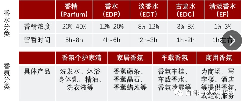 香水根據(jù)留香時間和香精濃度可分為5類,香精濃度越高,香水的留香時間越長、價格也越高。在這5類香中,中國女性消費者更傾向使用淡香水EDT,男性更加偏向于使用香味較淡的香水,多用古龍水EDC。