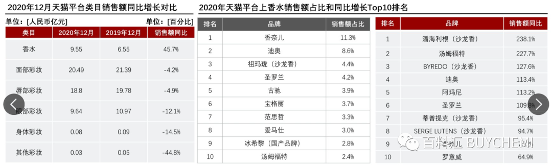 與2019年12月相比,2020年由于疫情需要佩戴口罩,臉部被遮擋導致消費者化妝需求減少。作為個人風格和精致度的體現(xiàn),香水在疫情期間成為彩妝的替代品,2020年12月香水的銷售額同比增長45.7%。