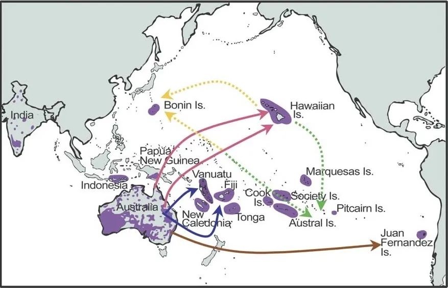 檀香種類的分布與傳播(引自美國植物學報)