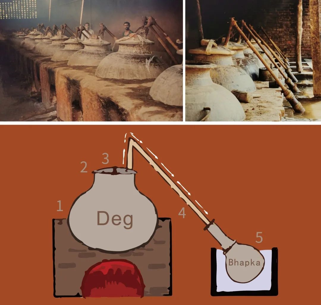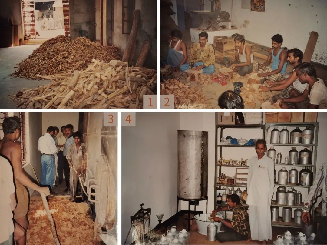 印度極富盛名的傳統(tǒng)檀香精油產(chǎn)品是Attar(Ittar)。Attar的生產(chǎn)工藝,即Deg 和Bhapka流程,非常獨特。一個裝置通常包括一個較大的可以直接加熱的銅罐(即Deg),用1-2個通常是竹子做的彎管連接到另一個較小的,里面盛著檀香精油銅罐(即Bhapka),這個小銅罐(Bhapka)放置于冷水池中進行冷卻。生產(chǎn)時,在Deg中按照配方放入水和不同的原料,如鮮花、香草料、香辛料、焙過的泥土等原料,連接并密封Deg和Bhapka及彎管后,直接用明火加熱Deg進行蒸餾,餾出的香氣成分經(jīng)過竹管后進入Bhapka,經(jīng)過冷水冷卻后,直接被Bhapka中的檀香精油吸收。蒸餾結(jié)束后,吸收了餾出香氣的檀香精油再經(jīng)過多年的陳化就完成了成品Attar。與調(diào)香師調(diào)香一樣,Deg中原料的配方和比例就是調(diào)香的秘密,決定了最終Attar的香氣特征。用玫瑰花瓣這樣生產(chǎn)出來的Attar就叫玫瑰Attar。