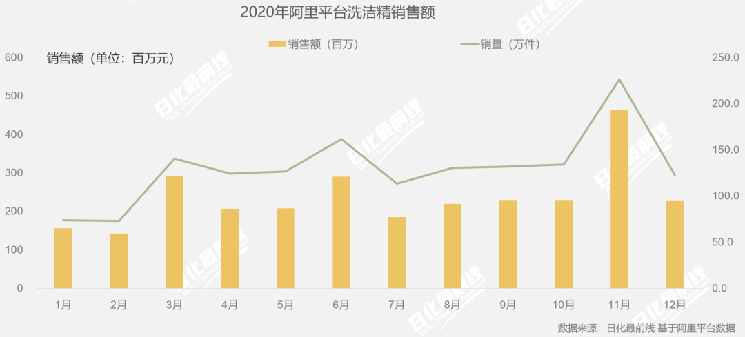 2020年阿里平臺(tái)洗潔精產(chǎn)品線上銷售額為11.9億元,同比增加24.6%。銷量約3700萬(wàn)+件,同比增加32.9%。