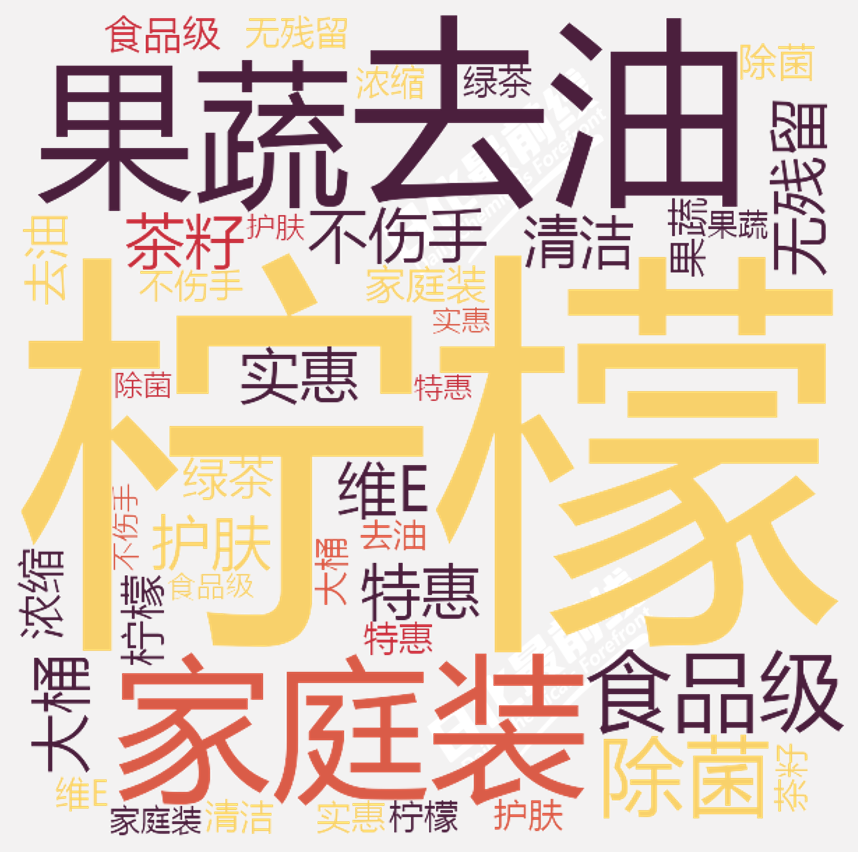 熱銷洗潔精產(chǎn)品大多強(qiáng)調(diào)其去油潔凈不傷手食品級(jí)的功效,另外檸檬香味是最主要的香味,與此同時(shí)家庭大桶裝、實(shí)惠特惠也是線上熱銷產(chǎn)品的主要賣點(diǎn)。
