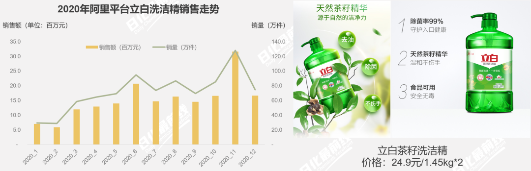 立白洗潔精在阿里平臺(tái)上的銷售額1.83億元,銷量864萬(wàn)件,銷售額同比增速39%;