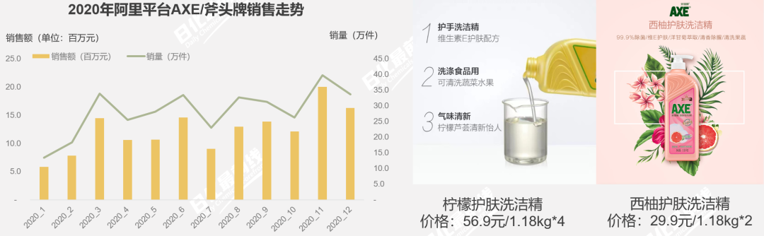 AXE/斧頭牌洗潔精在阿里平臺(tái)上的銷售額1.48億元,銷量將近340萬(wàn)件,銷售額同比增速38%;