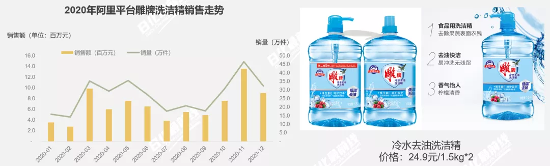 雕牌洗潔精在阿里平臺(tái)上的銷售額將近8100萬(wàn)元,銷量將近323萬(wàn)+件,銷售額同比增速29%;