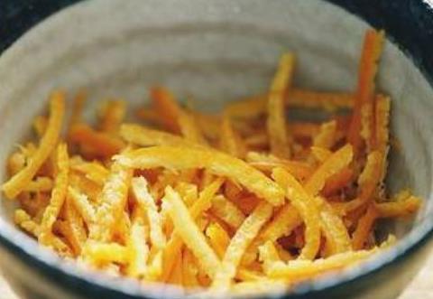 2.我們先把橘子皮用清水沖洗干凈,瀝干多余的水分之后用小刀或者剪刀,把橘子皮切成細條狀。此時取出我們準備好的玻璃容器,正常的玻璃罐就可以,把橘子皮全部倒入玻璃罐子中(橘子皮的量最好在罐子的三分之一左右最合適)。