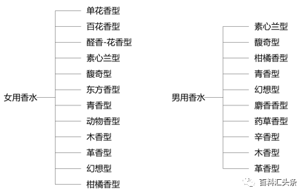 把香水香型分為女用和男用兩大類,每大類又分為若干小類,如下所示。