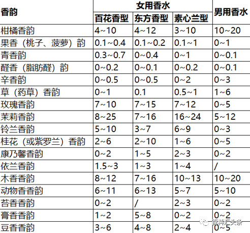 表香水香韻構(gòu)成比例(質(zhì)量分?jǐn)?shù)/%)
