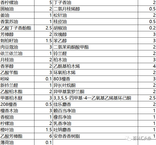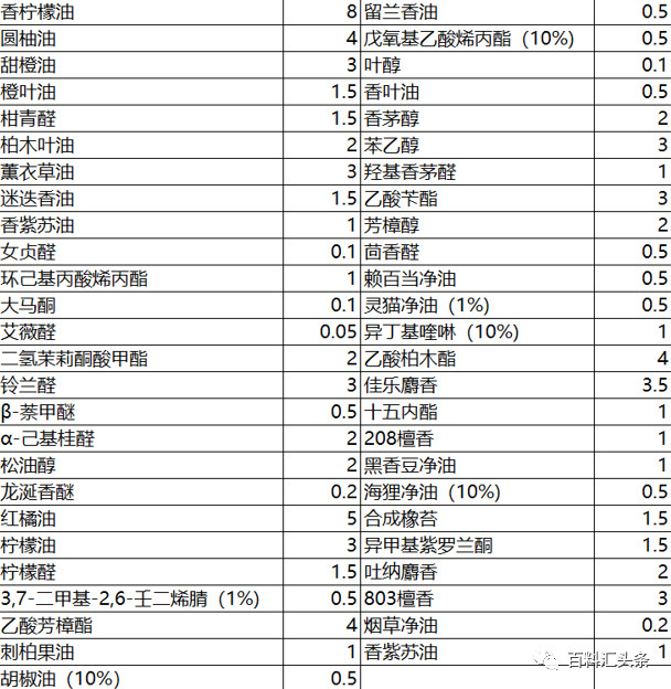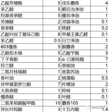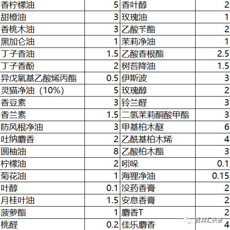 2、百花香型(復(fù)合花香型)香精配方舉例——百花香型香精配方(質(zhì)量份)