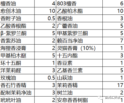 (9)木香(包括木香兼有龍涎香或壤香):檀香油(天然品)、803檀香、208檀香、檀香醚、伊斯波(ISO Esuper)、乙酰基柏木烯、甲基柏木醚、柏木油、乙酸柏木酯、廣藿香油、香根油、乙酸香根酯。