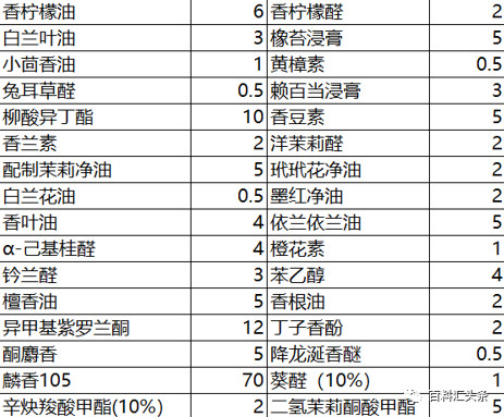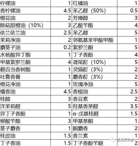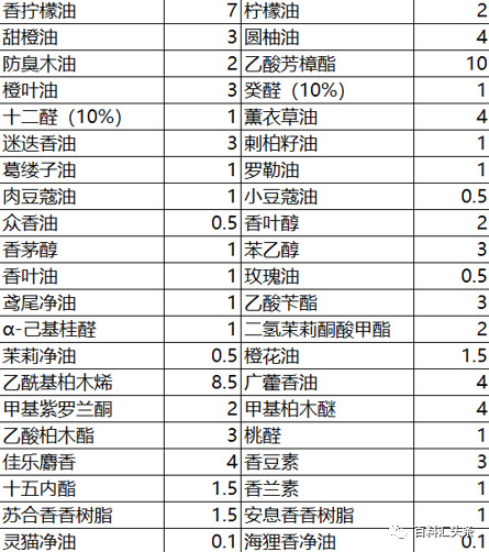 (6)橙花香:橙花凈油、橙葉油、橙花醇、白蘭葉油。