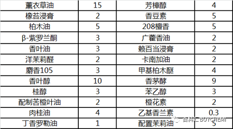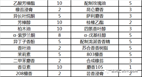 2、檀香、檀香-花香復(fù)合型香精配方舉例——檀香香精配方(質(zhì)量份)