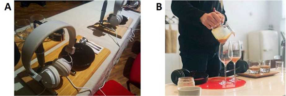 最后,你會通過一副無線耳機(jī)獲得一杯咖啡,以提供真正的多感官品嘗體驗[154]。與此同時,在多感官咖啡體驗設(shè)計的高端領(lǐng)域,像Rasmus Helgebostad和Matt Winton這樣的頂級咖啡師在幾年前就制作了一種聲學(xué)增強(qiáng)咖啡飲料,作為他們咖啡師錦標(biāo)賽的一部分(見圖2)。